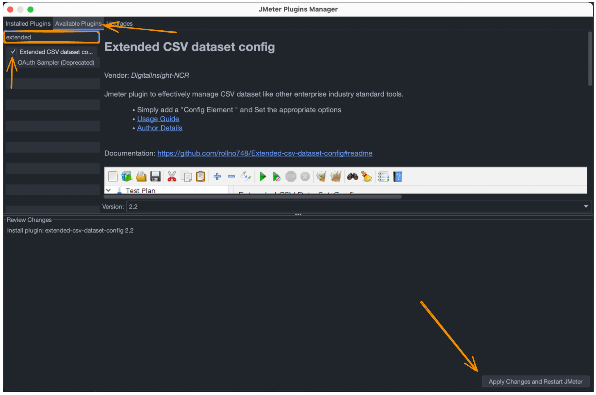 A window should open for the “Plugins Manager.” Select the “Available Plugins” tab and search for the plugin by name. Once identified, mark the checkbox and choose “Apply Changes and Restart JMeter” in the lower right corner.