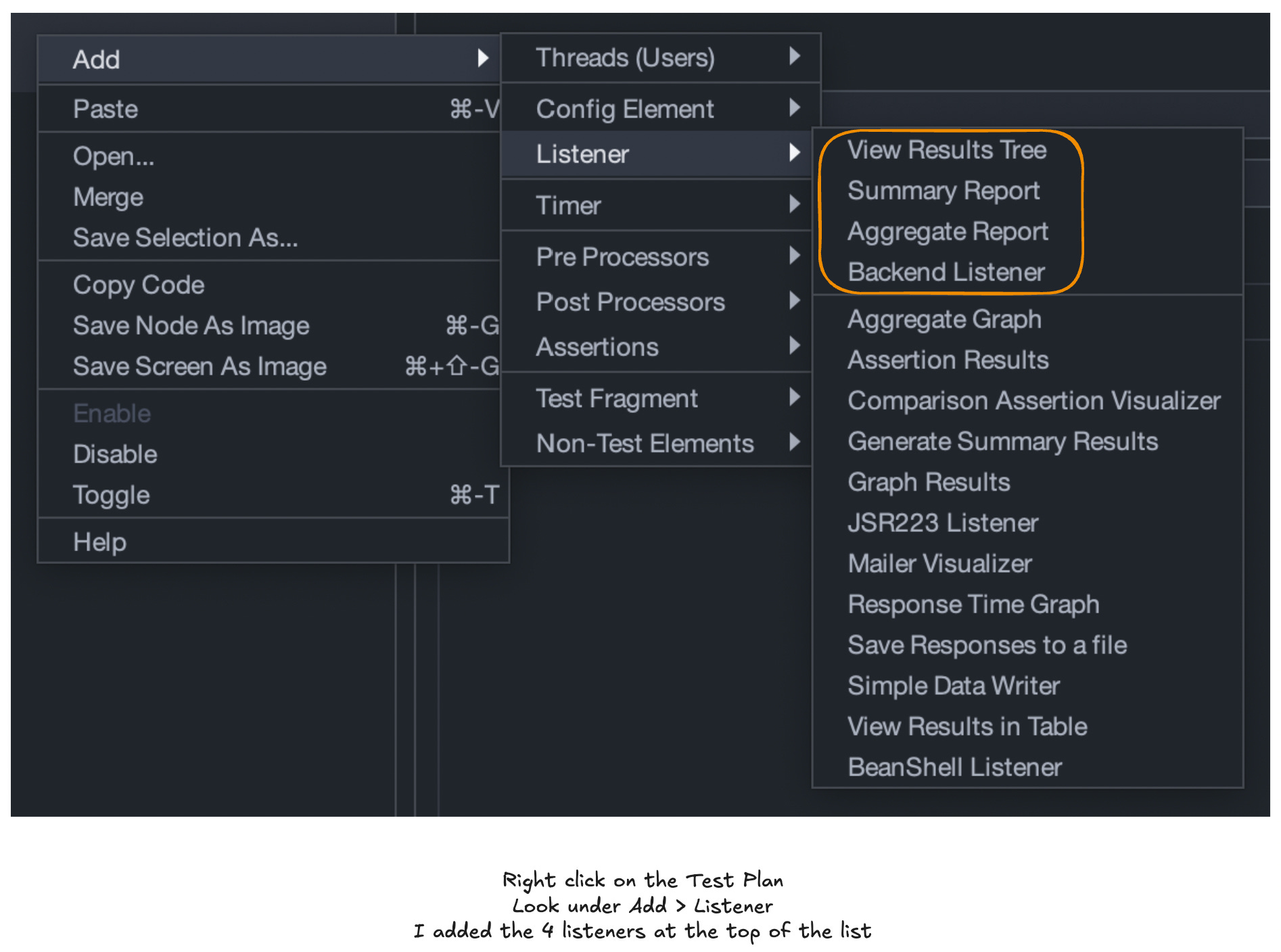 🚨 Check whether you want your Listeners under the Test Plan or in nested elements added below! I wanted a snapshot of the overall so I added mine to the Test Plan.